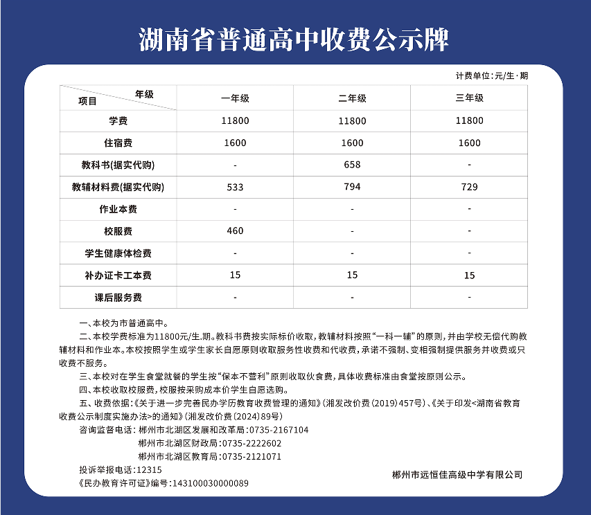 郴州市远恒佳高级中学2025秋季学期收费公示